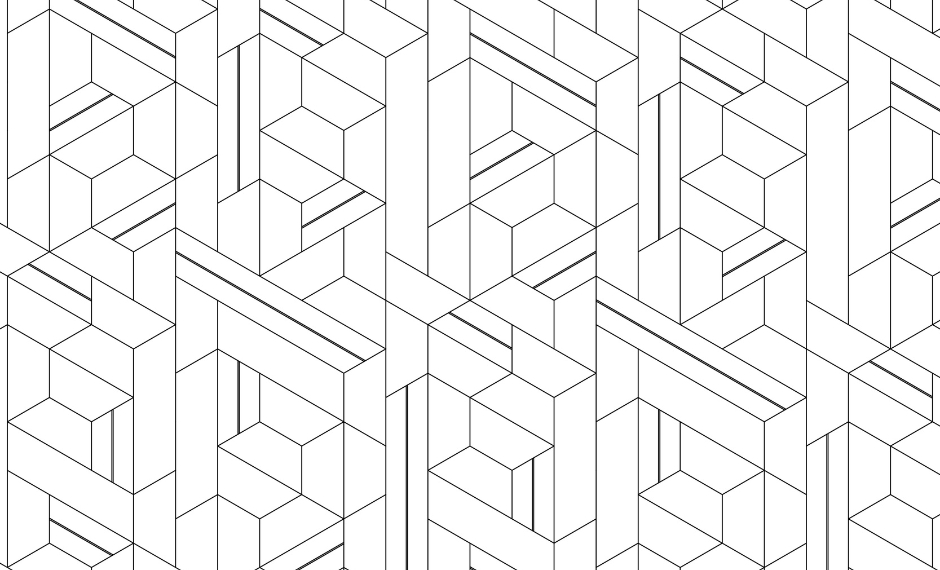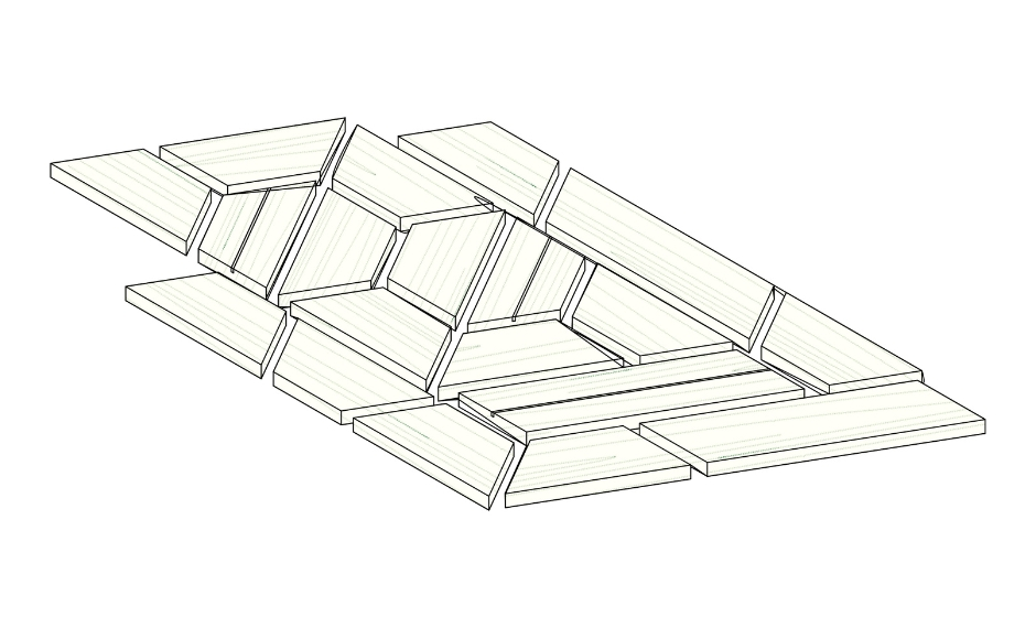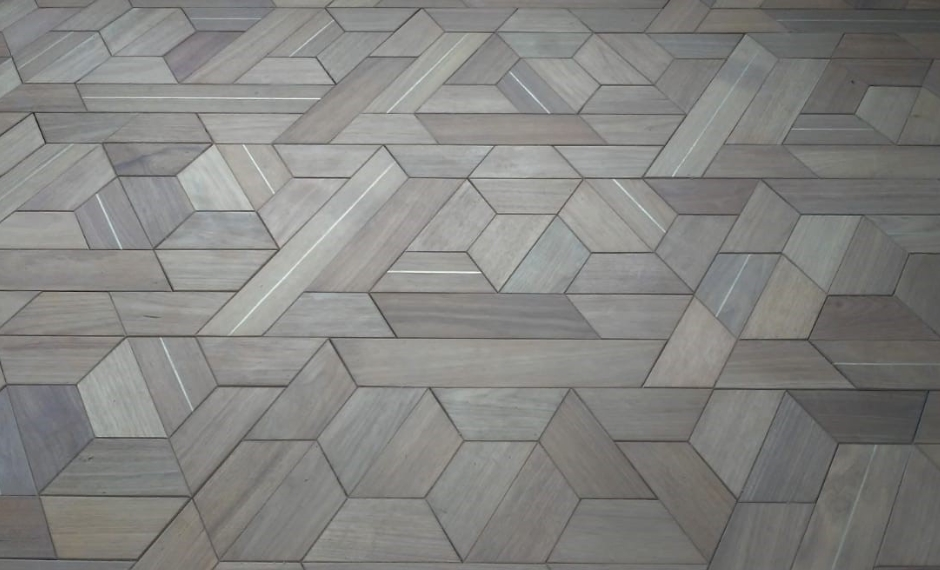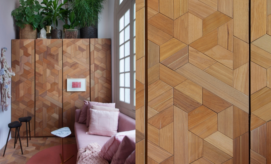Revestimento de madeira maciça geométrico, desenvolvido com 3 módulos individuais com inserts metálicos que combinados formam uma padronagem não repetitiva.